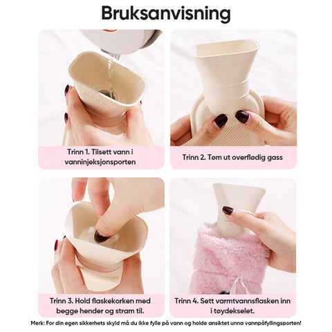 Utvidet varmeområde: Med en stor kapasitet på 2 liter har denne varmtvannsflasken et større varmeområde enn vanlige, mindre flasker, noe som gir varme over et større område. For optimal bruk bør den fylles til ca. 2/3 av kapasiteten, slik at du unngår overfylling.