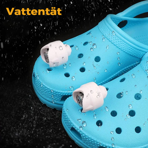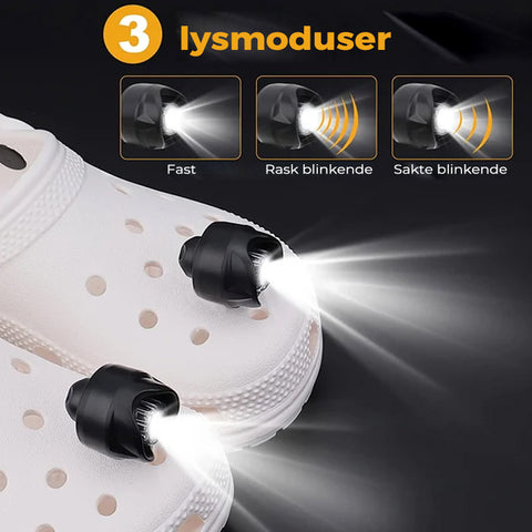 Verdens første og eneste mini frontlykter for hullsko. Disse kompakte og praktiske lysene kan enkelt festes til skoene dine, slik at du kan se og bli sett om natten.